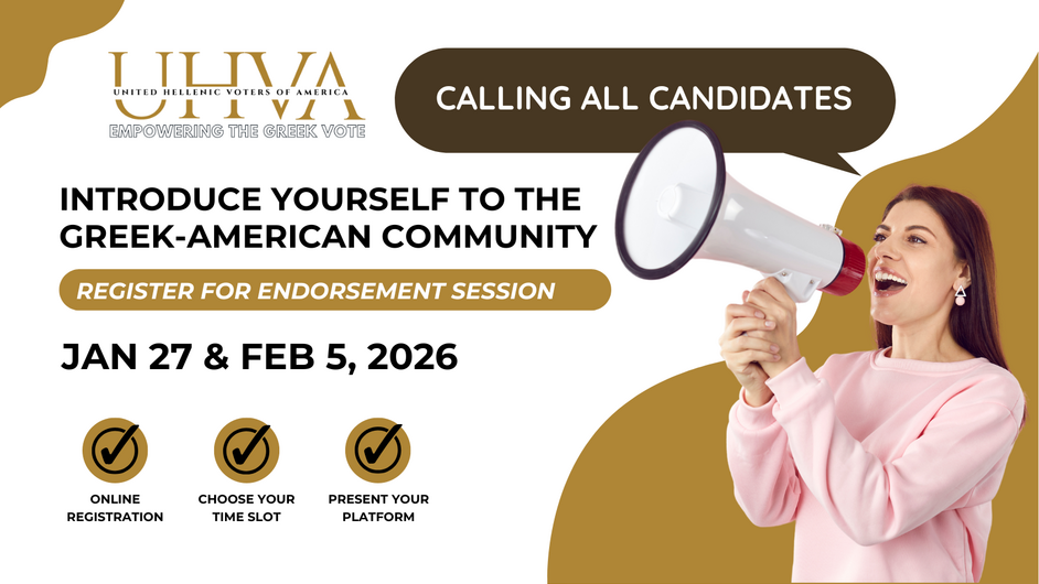 Candidates are invited to present your viewpoints and credentials for the office you are seeking so that we may make informed decisions as to which candidates our organization will endorse. Each candidate will be allotted time to briefly summarize the main points of their platform. After the presentations, there may be an informal question and answer session withthe Board of Directors of the United Hellenic Voters of America. By participating in the UHVA Endorsement Sessions, candidates demonstrate that they actively seek the support of the Greek-American voters.
